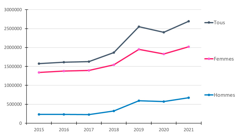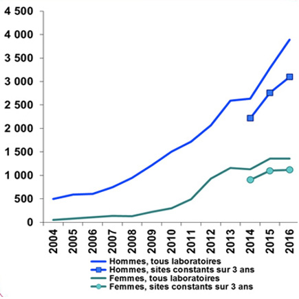 Les trois-quarts des personnes dépistées étaient des femmes, avec un taux de dépistage près de trois fois plus élevé chez celles-ci (68 pour 1 000) que chez les hommes (26 pour 1 000). Du fait de l’utilisation d’une PCR multiplex permettant de dépister conjointement une infection à gonocoque et une infection à Ct, le taux de dépistage était encore plus important chez les femmes de 15-25 ans (150 pour 1 000), chez lesquelles il est recommandé un dépistage systématique des infections à Ct. Mais depuis 2019, ce taux de dépistage est très proche de celui chez les femmes de 26-49 ans (145 pour 1 000).