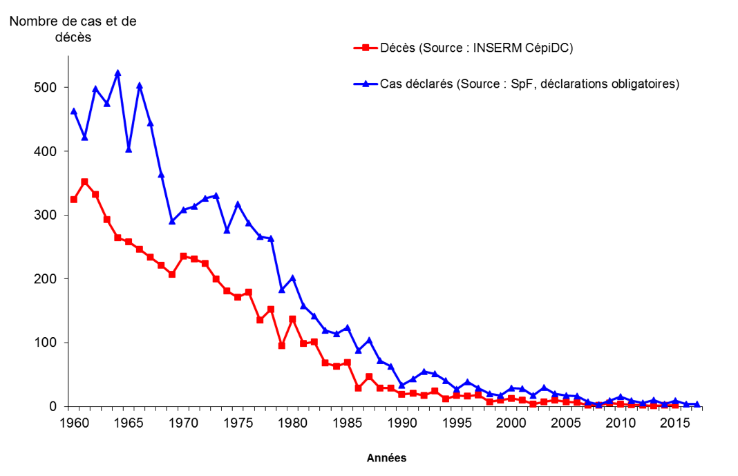 On constate une nette diminution des cas de tétanos depuis 1960. En effet, entre 1 et 10 cas ont été déclarés chaque année au cours de ces 10 dernières années, soit une incidence annuelle moyenne de 0,07 cas/million d'habitants sur cette période (comprise entre 0,02 et 0,15 cas/million d'habitants).