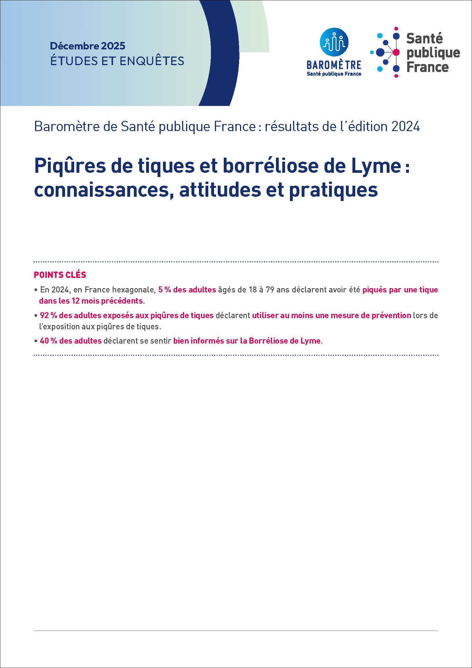 En 2024, en France hexagonale, 5 % des adultes âgés de 18 à 79 ans déclarent avoir été piqués par une tique dans les 12 mois précédents. 92 % des adultes exposés aux piqûres de tiques déclarent utiliser au moins une mesure de prévention lors de l'exposition aux piqûres de tiques. 40 % des adultes déclarent se sentir bien informés sur la Borréliose de Lyme.