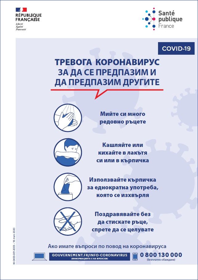 Cette affiche en bulgare illustre les gestes à adopter pour se protéger et protéger les autres du coronavirus (Covid-19). Titre : ТРЕВОГА КОРОНАВИРУС : ЗА ДА СЕ ПРЕДПАЗИМ И ДА ПРЕДПАЗИМ ДРУГИТЕ