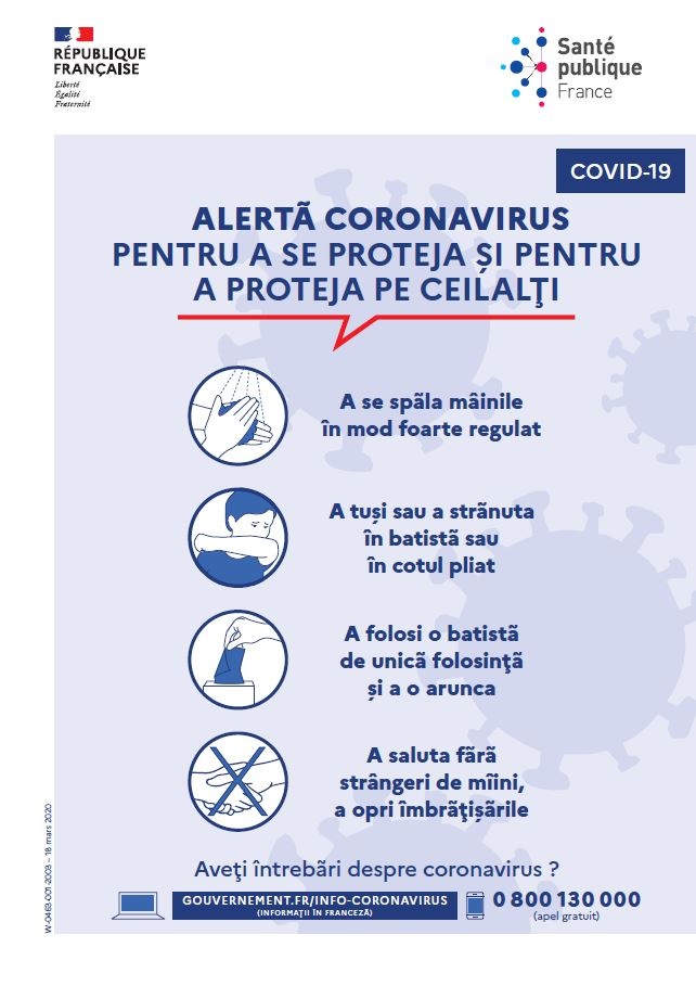 Cette affiche en roumain illustre les gestes à adopter pour se protéger et protéger les autres du coronavirus (Covid-19). Titre : Alertã coronavirus : pentru a se proteja şi pentru a proteja pe ceilalţi