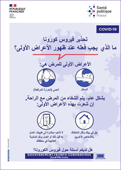 Cette affiche illustre les premiers symptômes du coronavirus et la conduite à tenir quand on les ressent.