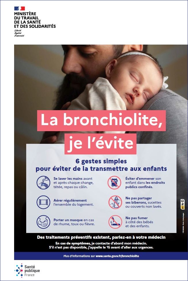 Cette affiche d'information rappelle les gestes barrières à adopter pour protéger les enfants du virus à l'origine de la bronchiolite. Elle met aussi en avant l'existence...