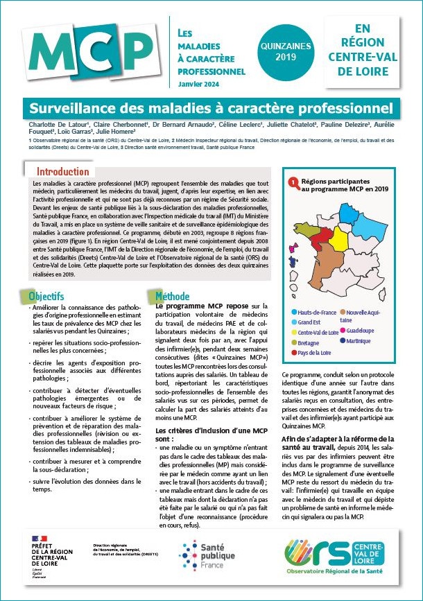 Santé publique France, en collaboration avec l'Inspection médicale du travail (IMT) du Ministère du Travail, a mis en place un système de veille sanitaire et de surveillance épidémiologique des maladies à caractère professionnel (MCP). En région Centre-Val de Loire, il est mené conjointement depuis 2008 entre Santé publique France, l'IMT de la Direction régionale de l'économie, de l'emploi, du travail et des solidarités (Dreets) Centre-Val de Loire et l'Observatoire régional de la santé (ORS) du Centre-Val de Loire. La surveillance des MCP consiste, pour les médecins du travail volontaires avec l'appui des infirmier.e.s, à signaler pendant deux semaines consécutives (dites "Quinzaines MCP") toutes les MCP rencontrées lors des consultations auprès des salariés. Cette plaquette porte sur l'exploitation des données des deux quinzaines réalisées en 2019 en région Centre-Val de Loire. 3 360 salariés ont été vus en consultation lors de ces deux quinzaines.