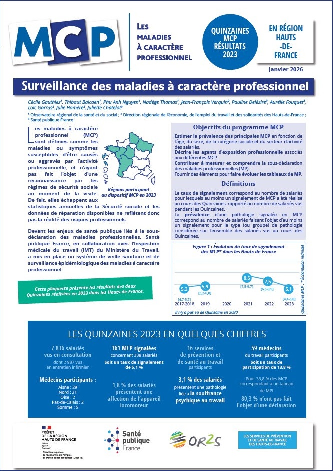 Dans le cadre de sa mission de surveillance épidémiologique des risques professionnels, Santé publique France a mis en place, en partenariat avec l'Inspection médicale du travail (IMT) du Ministère du Travail, un dispositif de surveillance épidémiologique des MCP. En Hauts-de-France, le programme est mené conjointement entre Santé publique France, l'IMT de la Direction régionale de l'économie, de l'emploi, du travail et des solidarités (Dreets) et l'observatoire régional de la santé et du social (OR2S). Il repose sur la participation volontaire de médecins du travail et de collaborateurs médecins de la région, qui signalent deux fois par an, avec l'appui des infirmier(ère)s. Cette plaquette présente les résultats des Quinzaines réalisées au cours de l'année 2023 dans la région.