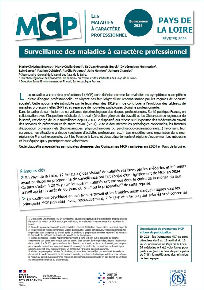 Les maladies à caractère professionnel (MCP) sont définies comme les maladies ou symptômes susceptibles d'être d'origine professionnelle1 et n'ayant pas fait l'objet d'une reconnaissance par les régimes de Sécurité sociale2. Cette notion a été introduite par le législateur dès 1919 afin de contribuer à l'évolution des tableaux de maladies professionnelles (MP) et au repérage de nouvelles pathologies d'origine professionnelle. Dans le cadre de sa mission de surveillance épidémiologique des risques professionnels, Santé publique France, en collaboration avec l'Inspection médicale du travail (Direction générale du travail) et les Observatoires régionaux de la santé, est chargé de leur surveillance depuis 2003. Le dispositif, qui repose sur l'expertise des médecins du travail des services de prévention et de santé travail (SPST), vise à documenter les pathologies concernées, les facteurs d'exposition professionnels (biomécaniques, physicochimiques ou psychosocio-organisationnels...) favorisant leur survenue, les situations à risque (secteurs d'activité, professions, etc.). Les enquêtes sont organisées dans neuf régions de France hexagonale, dont les Pays de la Loire, et deux départements et régions d'outre-mer. Les médecins et leur équipe qui y participent sont volontaires. Cette plaquette présente les principales données des Quinzaines MCP réalisées en 2024 en Pays de la Loire.