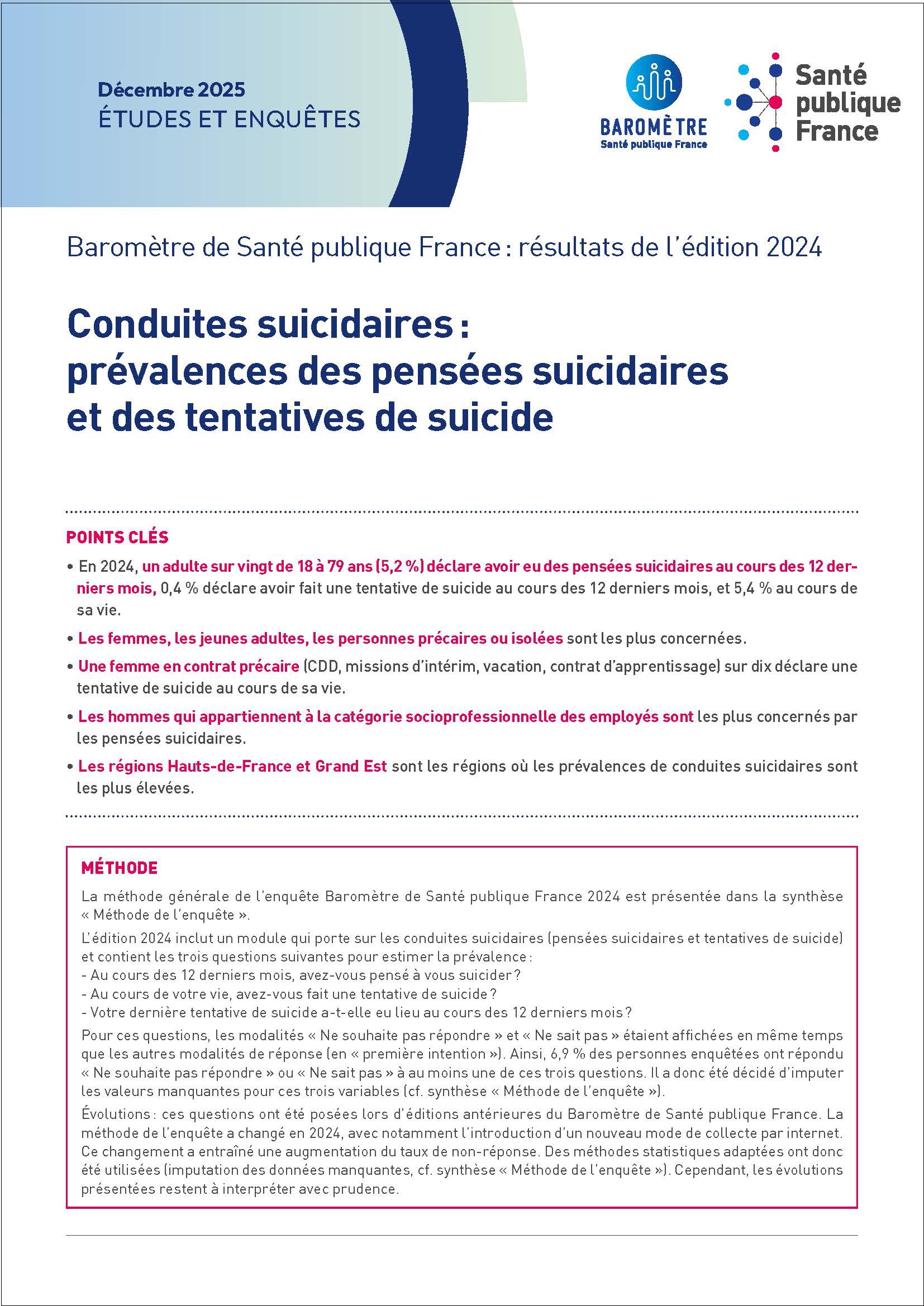 En 2024, un adulte sur vingt de 18 à 79 ans (5,2 %) déclare avoir eu des pensées suicidaires au cours des 12 derniers mois, 0,4 % déclare avoir fait une tentative de suicide au cours des 12 derniers mois, et 5,4 % au cours de sa vie. Les femmes, les jeunes adultes, les personnes précaires ou isolées sont les plus concernées. Une femme en contrat précaire (CDD, missions d'intérim, vacation, contrat d'apprentissage) sur dix déclare une tentative de suicide au cours de sa vie. Les hommes qui appartiennent à la catégorie socioprofessionnelle des employés sont les plus concernés par les pensées suicidaires. Les régions Hauts-de-France et Grand Est sont les régions où les prévalences de conduites suicidaires sont les plus élevées.