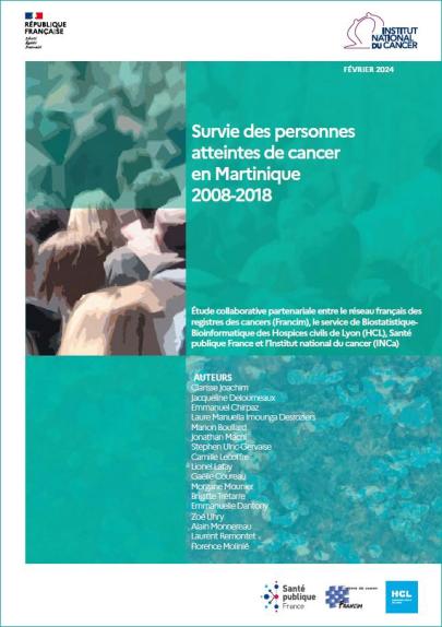 Indicateur clé pour l'observation et la surveillance épidémiologique des cancers avec l'incidence, la mortalité et la prévalence, la survie est essentielle pour évaluer le système de santé dans sa globalité et mesurer l'impact des politiques publiques en matière de prévention, de dépistage, et de soins. Il s'agit de la première étude de survie réalisée à partir des données des registres pour les 3 départements et régions d'outre-mer (DROM) de la Guadeloupe, la Martinique et La Réunion. Ces travaux s'inscrivent dans les objectifs du plan cancer 2014-2019 et de la Stratégie décennale de lutte contre les cancers 2021-2030, en particulier l'axe relatif à la lutte contre les cancers de mauvais pronostics. Ces résultats présentés dans des publications distinctes pour chaque département, proposent des estimations de la survie à 1 et 5 ans après le diagnostic de cancer pour dix localisations cancéreuses et comparent ces estimations à celles réalisées dans l'Hexagone publiées entre septembre 2020 et juillet 2021. Les éléments essentiels de la méthode utilisée font l'objet d'un document distinct. Le choix a été fait de commenter les résultats pour chaque localisation puis de donner des éléments de comparaison avec l'Hexagone pour mieux comprendre les spécificités rencontrées sur le territoire. Plus de 1 500 nouveaux cas de cancers invasifs sont enregistrés chaque année en Martinique. Les taux d'incidence standardisés monde placent la Martinique parmi les régions de France ayant les plus faibles taux d'incidence de cancer avec la Guadeloupe et la Guyane. Cependant, en Martinique, la distribution des cancers diffère sensiblement de celle de l'Hexagone avec de fortes disparités pour certaines localisations cancéreuses. Des incidences plus élevées que dans l'Hexagone sont retrouvées pour le cancer de la prostate, de l'estomac, du col de l'utérus et dans une moindre mesure les myélomes multiples et plasmocytomes. En Guadeloupe et en Martinique, des inégalités sociales d'incidences ont été mises en évidence pour certaines localisations. Les études de survie présentées ici fourniront des données complémentaires essentielles pour une adaptation des mesures de la stratégie décennale de lutte contre les cancers 2021- 2030 sur ces territoires. En Martinique, la survie nette standardisée des cancers est globalement inférieure à celle de l'Hexagone mais les résultats montrent de grandes disparités parmi les dix localisations cancéreuses étudiées. Au total, 10 localisations ont été étudiées et sont présentées dans ce rapport : lèvre-bouche-pharynx, oesophage, estomac, côlon et rectum, poumon, prostate, sein, corps et col de l'utérus pour les tumeurs solides ; myélomes multiples et plasmocytomes pour les tumeurs hématologiques. Ces localisations sont présentées pour la période entre 2008 et 2015. Il est à noter quatre cas de figure par rapport à la France hexagonale : la survie nette standardisée est légèrement mais significativement supérieure en Martinique pour le cancer de la prostate, donc la survie en Martinique de cette localisation est plus favorable par rapport à celle de la France hexagonale ; en Martinique, les SNS, chez l'homme et la femme, ne présentent pas de différences notables avec la France hexagonale pour les localisations suivantes : lèvre-bouche-pharynx, estomac, poumon, col de l'utérus, myélome multiple et plasmocytome. La survie est donc équivalente à celle de la France hexagonale ; les survies nettes standardisées, chez l'homme et la femme, sont inférieures à celles de la France hexagonale pour les localisations suivantes : sein, côlon-rectum et corps de l'utérus. Enfin, en Martinique et en Guadeloupe, les survies nettes standardisées, chez l'homme et la femme, sont nettement inférieures à celles de la France hexagonale pour le cancer de l'œsophage. La situation est donc défavorable par rapport à celle de la France hexagonale pour cette localisation.