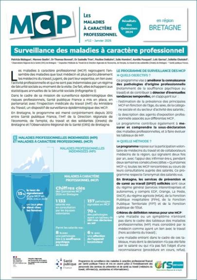 Les maladies à caractère professionnel (MCP) regroupent toutes les maladies que tout médecin et plus particulièrement les médecins du travail, jugent en lien avec l'activité professionnelle et qui ne sont pas indemnisées par un régime de Sécurité sociale. Elles échappent aux statistiques annuelles de la Sécurité sociale. Dans le cadre de sa mission de surveillance épidémiologique des risques professionnels, Santé publique France (SpF) a mis en place, en partenariat avec l'Inspection médicale du travail (IMT) du Ministère du Travail, un dispositif de surveillance épidémiologique des MCP. En Bretagne, le programme est mené conjointement depuis 2012 entre SpF, l'IMT de la Direction régionale des entreprises, de la concurrence, de la consommation, du travail et de l'emploi (Direccte) de Bretagne et l'Observatoire Régional de la Santé (ORS) de Bretagne. Le programme de surveillance des MCP repose sur la participation volontaire de médecins du travail et de collaborateurs médecins de la région, qui signalent deux fois par an, avec l’appui des infirmier(e)s, pendant deux semaines consécutives (dites "Quinzaines MCP"), tous les cas de MCP rencontrées au cours de leurs consultations auprès des salariés. Ce programme respecte l’anonymat des salariés vus. En 2024, 1133 salariés ont été vus en consultation lors des deux Quinzaines en Bretagne.