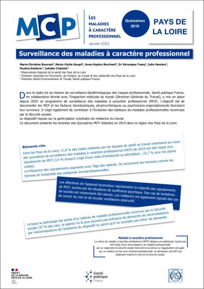 Dans le cadre de sa mission de surveillance épidémiologique des risques professionnels, Santé publique France, en collaboration étroite avec l'Inspection médicale du travail (Direction Générale du Travail), a mis en place depuis 2003 un programme de surveillance des maladies à caractère professionnel (MCP). L'objectif est de documenter les MCP et les facteurs biomécaniques, physicochimiques ou psychosocio-organisationnels favorisant leur survenue. Il s'agit également de contribuer à l'évolution des tableaux de maladies professionnelles reconnues par la Sécurité sociale. Le dispositif repose sur la participation volontaire de médecins du travail. Ce document présente les données des Quinzaines MCP réalisées en 2019 dans la région des Pays de la Loire.