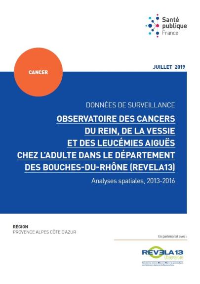 L'Observatoire REVELA13 enregistre, depuis 2012, les cancers incidents du rein, de la vessie et les leucémies aiguës de l'adulte sur le département des Bouches-du-Rhône, à partir de trois sources de données : les fiches de réunions de concertations pluridisciplinaires, le programme de médicalisation de l'information des établissements hospitaliers et les comptes rendus d'anatomopathologie. Tous les cas sont géolocalisés à l'adresse de résidence au moment du diagnostic. Ce rapport présente la répartition spatiale des cas incidents de ces trois cancers ciblés en prenant en compte l'influence de la défaveur sociale et de l'accès à un spécialiste (cancers urologiques uniquement). L'objectif principal est d'identifier, par différentes méthodes, l'existence ou non de clusters de ces cancers sur le département, sans hypothèses a priori. L'étude a été conduite sur les années 2013-2016. Au niveau départemental, l'incidence estimée du cancer de la vessie chez les personnes de 20 ans et plus était significativement supérieure à l'incidence nationale pour les deux sexes. Chez les hommes, une surincidence des cancers de la vessie a été identifiée dans la partie sud-est du département avec deux clusters significatifs, le premier incluant six arrondissements de Marseille et le deuxième incluant deux arrondissements de Marseille et 20 communes au sud-est de la ville. Chez les femmes, il n'a pas été retrouvé de zone avec une surincidence localisée des cancers de la vessie, ce qui peut être lié au faible effectif. En revanche, un cluster significatif, incluant neuf arrondissements de Marseille et une commune située à l'est de la ville, a été identifié. Les différences de répartition géographique observées à l'échelle de la commune n'étaient pas expliquées par la défaveur sociale chez l'homme et la femme. En revanche, cette répartition était liée à l'accès à un urologue pour les femmes. Les incidences départementales estimées du cancer du rein et des leucémies aiguës myéloïdes chez les personnes de 20 ans et plus n'étaient pas différentes des incidences nationales pour les deux sexes. Les niveaux d'incidence de cancer du rein étaient répartis de façon homogène sur le territoire et aucun cluster n'a été identifié. Les mêmes résultats étaient observés pour les leucémies aiguës myéloïdes. Ces résultats ont porté sur un faible nombre de cas et devront être confirmés avec un effectif plus élevé, nécessitant une période de recueil plus longue. La convergence des résultats obtenus par différentes méthodes et la cohérence avec ceux issus de la littérature sont encourageants pour la poursuite de cette expérimentation. Ces résultats ont permis de répondre aux objectifs définis lors de la création de REVELA13 et apportent des premières réponses au niveau populationnel. Ils doivent cependant être confirmés par des analyses spatiales supplémentaires, notamment à l'échelle de l'Iris pour identifier d'éventuels clusters nichés au sein d'une commune. Ces résultats pourront être complétés par d'autres études pour formuler des hypothèses sur les facteurs d'exposition en lien avec les clusters identifiés.