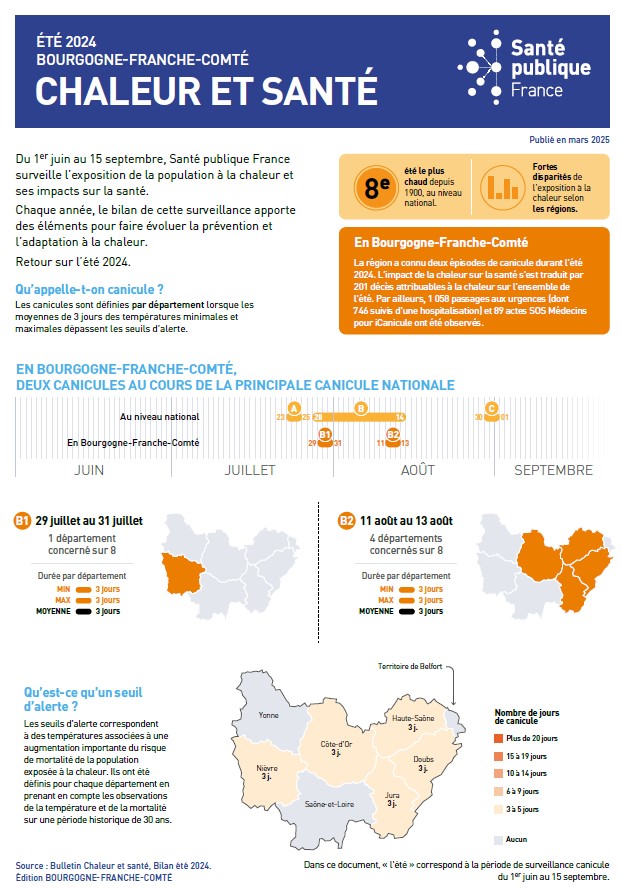 La région Bourgogne-Franche-Comté a connu deux épisodes de canicule durant l'été 2024. L'impact de la chaleur sur la santé s'est traduit par 201 décès attribuables à la chaleur sur l'ensemble de l'été. Par ailleurs, 1 058 passages aux urgences (dont 746 suivis d'une hospitalisation) et 89 actes SOS Médecins pour iCanicule ont été observés.