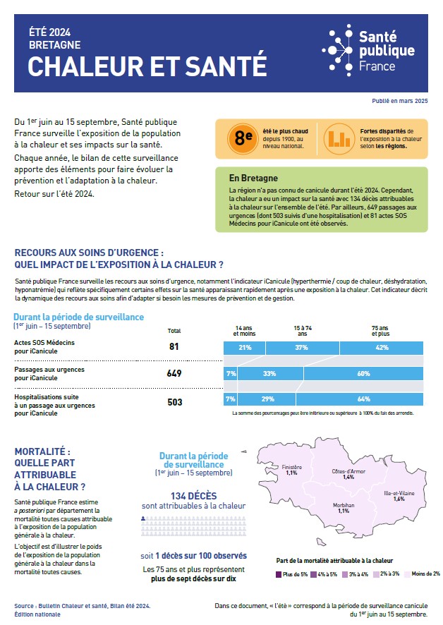 La région Bretagne n'a pas connu de canicule durant l'été 2024. Cependant, la chaleur a eu un impact sur la santé avec 134 décès attribuables à la chaleur sur l'ensemble de l'été. Par ailleurs, 649 passages aux urgences (dont 503 suivis d'une hospitalisation) et 81 actes SOS Médecins pour iCanicule ont été observés.