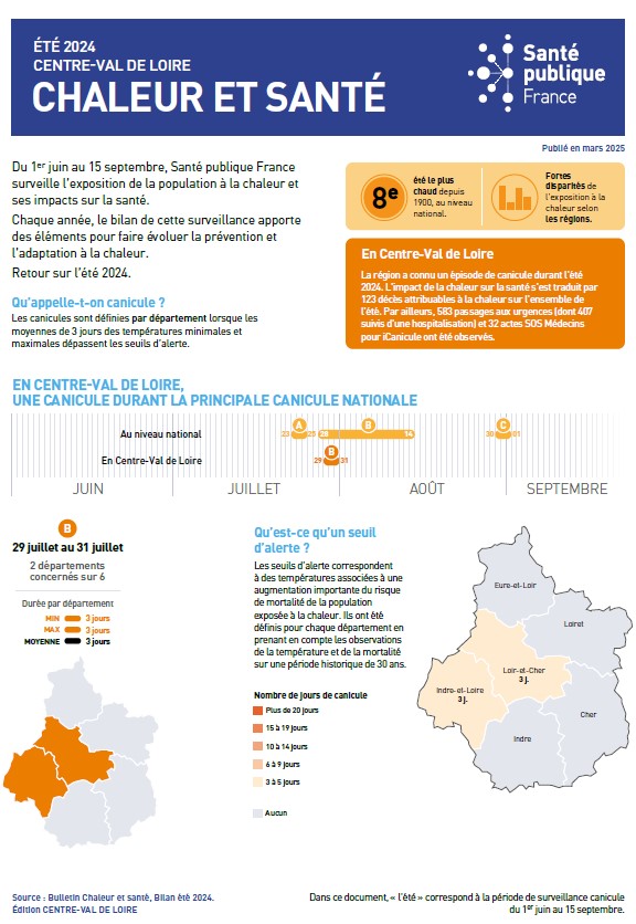 La région Centre-Val de Loire a connu un épisode de canicule durant l'été 2024. L'impact de la chaleur sur la santé s'est traduit par 123 décès attribuables à la chaleur sur l'ensemble de l'été. Par ailleurs, 583 passages aux urgences (dont 407 suivis d'une hospitalisation) et 32 actes SOS Médecins pour iCanicule ont été observés. Lien vers le bulletin Chaleur et santé en Centre-Val de Loire. Bilan de l'été 2024.