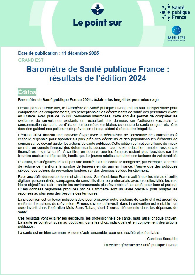 Depuis plus de trente ans, le Baromètre de Santé publique France est un outil indispensable pour comprendre les comportements, les perceptions et les déterminants de santé des personnes vivant en France. Avec plus de 35 000 personnes interrogées, cette enquête permet de compléter les systèmes de surveillance existants en recueillant des données sur l'adhésion vaccinale, la consommation de tabac ou d'alcool, les pensées suicidaires ou encore la santé perçue, etc. Ces données guident les politiques de prévention et aident à réduire les inégalités. Le Baromètre 2024 de Santé publique France marque une avancée significative dans l'analyse de l'état de santé dans la région. Pour la première fois, il offre une vision fine et détaillée à l'échelle régionale, permettant d'aller au-delà des seules tendances nationales. Cette édition inaugure une série d'indicateurs qui seront suivis dans les prochaines versions du Baromètre afin notamment d'analyser leurs évolutions. Les résultats permettent dès à présent de situer la région au regard des thèmes étudiées et de soulever des hypothèses quant aux variations observées selon l'âge, le genre, la profession, les catégories socio-professionnelles, le type de ménage et la zone d'habitation (urbain/rural). Les associations observées entre ces variables pourront faire l'objet d'analyses approfondies, afin de mieux cerner les facteurs influençant la santé perçue et les déterminants de santé. Cette approche territoriale apporte une valeur ajoutée majeure : elle renseigne sur la situation régionale, qu'il s'agisse des comportements, des perceptions ou de l'exposition aux déterminants sociaux de la santé.
