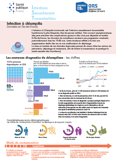 L’infection à Chlamydia trachomatis est l’infection sexuellement transmissible bactérienne la plus fréquente chez les jeunes adultes. Très souvent asymptomatique, elle peut entraîner des complications graves si elle n’est pas dépistée et traitée. En Île-de-France, les données de surveillance montrent une progression constante particulièrement chez les 15-25 ans. Cette tendance reflète à la fois une augmentation réelle des cas et une amélioration du dépistage. La mise en lumière de ces données régionales permet de mieux cibler les actions de prévention, dépistage et traitement, afin de limiter la transmission et protéger la santé sexuelle des Franciliens.