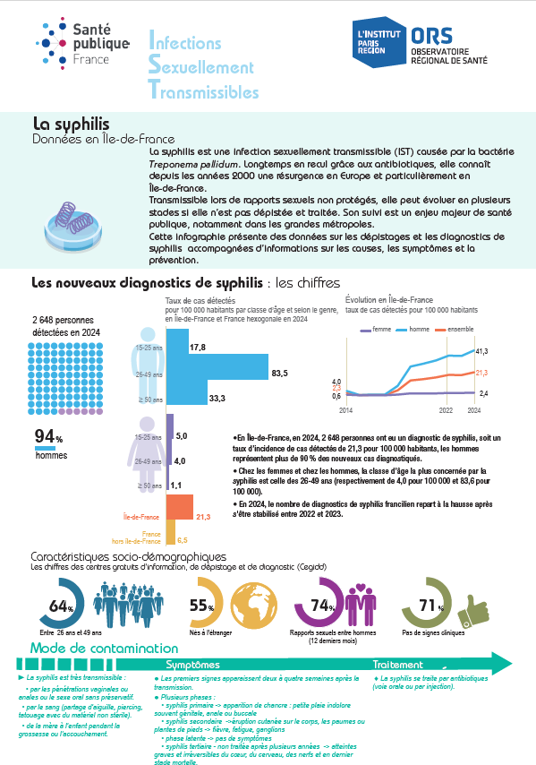La syphilis est une infection sexuellement transmissible (IST) causée par la bactérie Treponema pallidum. Longtemps en recul grâce aux antibiotiques, elle connaît depuis les années 2000 une résurgence en Europe et particulièrement en Île-de-France. Transmissible lors de rapports sexuels non protégés, elle peut évoluer en plusieurs stades si elle n’est pas dépistée et traitée. Son suivi est un enjeu majeur de santé publique, notamment dans les grandes métropoles. Cette infographie présente des données sur les dépistages et les diagnostics de syphilis accompagnées d’informations sur les causes, les symptômes et la prévention.