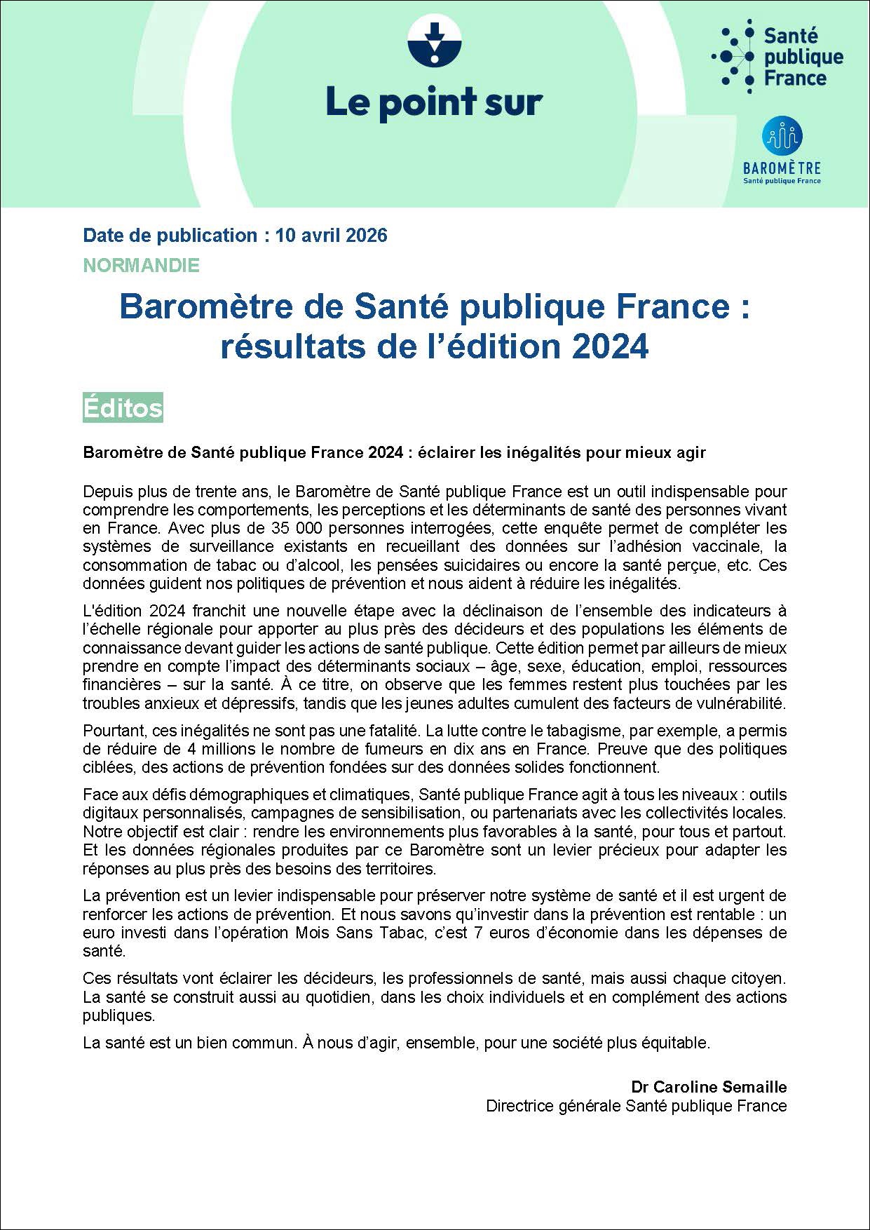 Depuis plus de trente ans, le Baromètre de Santé publique France est un outil indispensable pour comprendre les comportements, les perceptions et les déterminants de santé des personnes vivant en France. Avec plus de 35 000 personnes interrogées, cette enquête permet de compléter les systèmes de surveillance existants en recueillant des données sur l'adhésion vaccinale, la consommation de tabac ou d'alcool, les pensées suicidaires ou encore la santé perçue, etc. Ces données guident les politiques de prévention et aident à réduire les inégalités. Le Baromètre 2024 de Santé publique France marque une avancée significative dans l'analyse de l'état de santé dans la région. Pour la première fois, il offre une vision fine et détaillée à l'échelle régionale, permettant d'aller au-delà des seules tendances nationales. Cette édition inaugure une série d'indicateurs qui seront suivis dans les prochaines versions du Baromètre afin notamment d'analyser leurs évolutions. Les résultats permettent dès à présent de situer la région au regard des thèmes étudiées et de soulever des hypothèses quant aux variations observées selon l'âge, le genre, la profession, les catégories socio-professionnelles, le type de ménage et la zone d'habitation (urbain/rural). Les associations observées entre ces variables pourront faire l'objet d'analyses approfondies, afin de mieux cerner les facteurs influençant la santé perçue et les déterminants de santé. Cette approche territoriale apporte une valeur ajoutée majeure : elle renseigne sur la situation régionale, qu'il s'agisse des comportements, des perceptions ou de l'exposition aux déterminants sociaux de la santé.