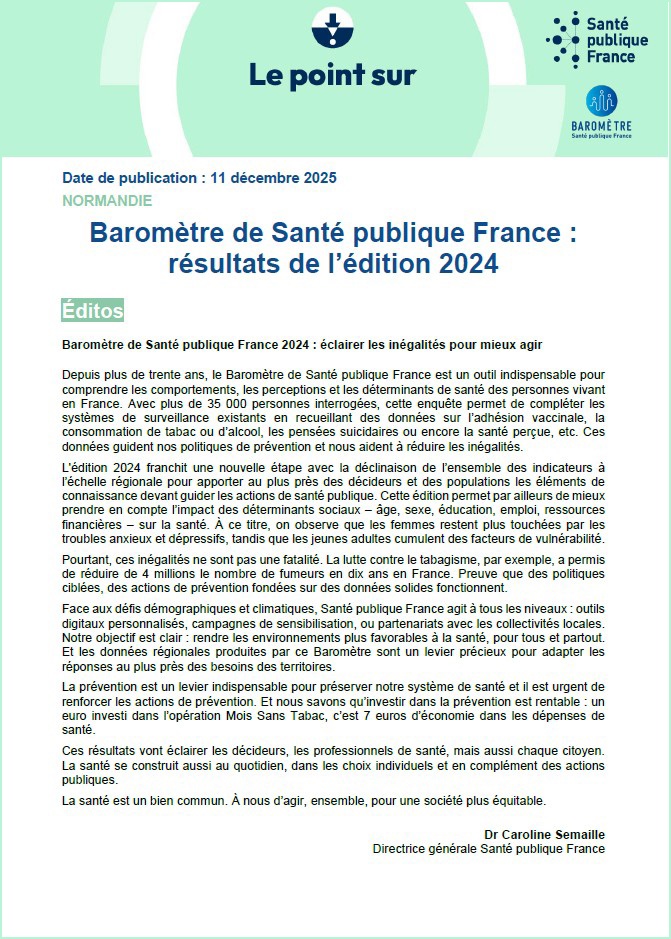 Depuis plus de trente ans, le Baromètre de Santé publique France est un outil indispensable pour comprendre les comportements, les perceptions et les déterminants de santé des personnes vivant en France. Avec plus de 35 000 personnes interrogées, cette enquête permet de compléter les systèmes de surveillance existants en recueillant des données sur l'adhésion vaccinale, la consommation de tabac ou d'alcool, les pensées suicidaires ou encore la santé perçue, etc. Ces données guident les politiques de prévention et aident à réduire les inégalités. Le Baromètre 2024 de Santé publique France marque une avancée significative dans l'analyse de l'état de santé dans la région. Pour la première fois, il offre une vision fine et détaillée à l'échelle régionale, permettant d'aller au-delà des seules tendances nationales. Cette édition inaugure une série d'indicateurs qui seront suivis dans les prochaines versions du Baromètre afin notamment d'analyser leurs évolutions. Les résultats permettent dès à présent de situer la région au regard des thèmes étudiées et de soulever des hypothèses quant aux variations observées selon l'âge, le genre, la profession, les catégories socio-professionnelles, le type de ménage et la zone d'habitation (urbain/rural). Les associations observées entre ces variables pourront faire l'objet d'analyses approfondies, afin de mieux cerner les facteurs influençant la santé perçue et les déterminants de santé. Cette approche territoriale apporte une valeur ajoutée majeure : elle renseigne sur la situation régionale, qu'il s'agisse des comportements, des perceptions ou de l'exposition aux déterminants sociaux de la santé.