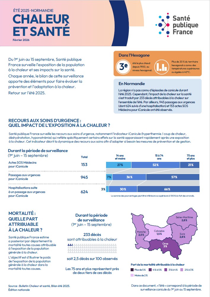 La région n'a pas connu d'épisodes de canicule durant l'été 2025. Cependant, l'impact de la chaleur sur la santé s'est traduit par 233 décès attribuables à la chaleur sur l'ensemble de l'été. Par ailleurs, 945 passages aux urgences (dont 624 suivis d'une hospitalisation) et 153 actes SOS Médecins pour iCanicule ont été observés.