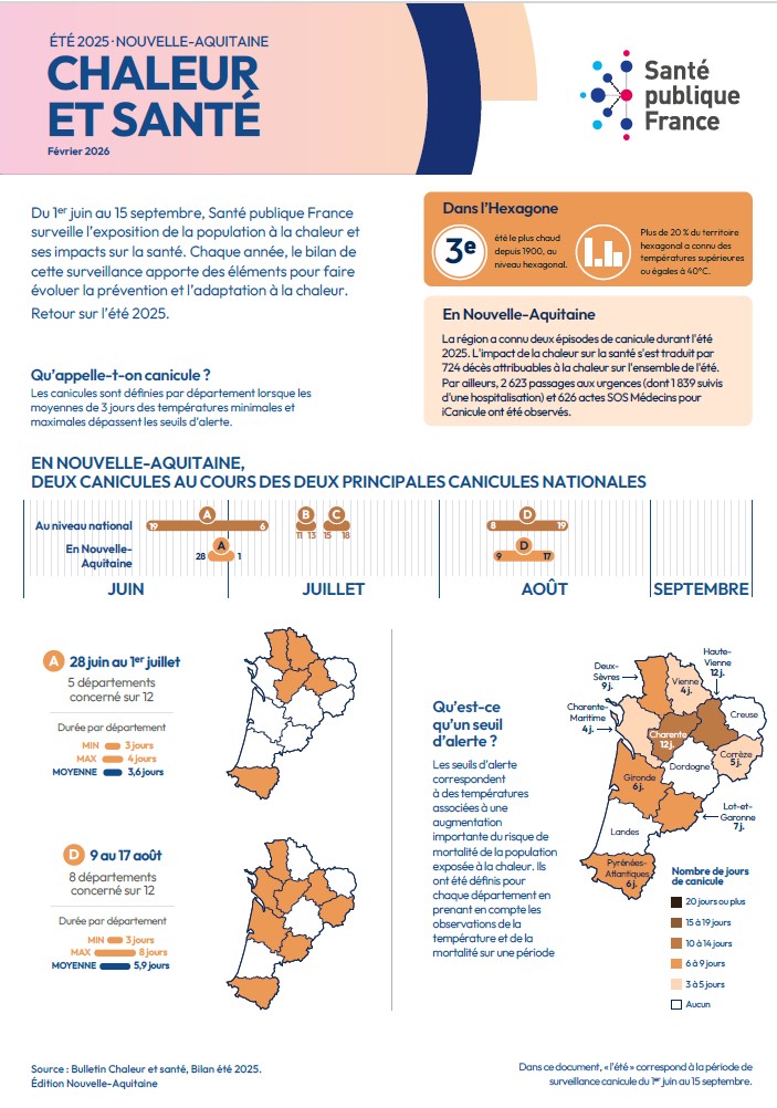 La région a connu deux épisodes de canicule durant l'été 2025. L'impact de la chaleur sur la santé s'est traduit par 724 décès attribuables à la chaleur sur l'ensemble de l'été. Par ailleurs, 2 623 passages aux urgences (dont 1 839 suivis d'une hospitalisation) et 626 actes SOS Médecins pour iCanicule ont été observés.