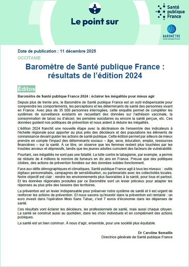 Depuis plus de trente ans, le Baromètre de Santé publique France est un outil indispensable pour comprendre les comportements, les perceptions et les déterminants de santé des personnes vivant en France. Avec plus de 35 000 personnes interrogées, cette enquête permet de compléter les systèmes de surveillance existants en recueillant des données sur l'adhésion vaccinale, la consommation de tabac ou d'alcool, les pensées suicidaires ou encore la santé perçue, etc. Ces données guident les politiques de prévention et aident à réduire les inégalités. Le Baromètre 2024 de Santé publique France marque une avancée significative dans l'analyse de l'état de santé dans la région. Pour la première fois, il offre une vision fine et détaillée à l'échelle régionale, permettant d'aller au-delà des seules tendances nationales. Cette édition inaugure une série d'indicateurs qui seront suivis dans les prochaines versions du Baromètre afin notamment d'analyser leurs évolutions. Les résultats permettent dès à présent de situer la région au regard des thèmes étudiées et de soulever des hypothèses quant aux variations observées selon l'âge, le genre, la profession, les catégories socio-professionnelles, le type de ménage et la zone d'habitation (urbain/rural). Les associations observées entre ces variables pourront faire l'objet d'analyses approfondies, afin de mieux cerner les facteurs influençant la santé perçue et les déterminants de santé. Cette approche territoriale apporte une valeur ajoutée majeure : elle renseigne sur la situation régionale, qu'il s'agisse des comportements, des perceptions ou de l'exposition aux déterminants sociaux de la santé.