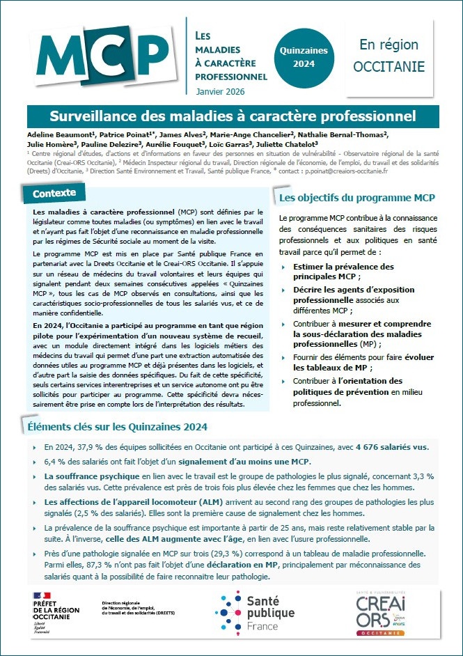 Les maladies à caractère professionnel (MCP) sont définies par le législateur comme toutes maladies (ou symptômes) en lien avec le travail et n'ayant pas fait l'objet d'une reconnaissance en maladie professionnelle par les régimes de Sécurité sociale au moment de la visite. Le programme MCP est mis en place par Santé publique France en partenariat avec la Dreets Occitanie et le Creai-ORS Occitanie. Il s'appuie sur un réseau de médecins du travail volontaires et leurs équipes qui signalent pendant deux semaines consécutives appelées "Quinzaines MCP", tous les cas de MCP observés en consultations, ainsi que les caractéristiques socio-professionnelles de tous les salariés vus, et ce de manière confidentielle. En 2024, l'Occitanie a participé au programme en tant que région pilote pour l'expérimentation d'un nouveau système de recueil, avec un module directement intégré dans les logiciels métiers des médecins du travail qui permet d'une part une extraction automatisée des données utiles au programme MCP et déjà présentes dans les logiciels, et d'autre part la saisie des données spécifiques. Du fait de cette spécificité, seuls certains services interentreprises et un service autonome ont pu être sollicités pour participer au programme. En 2024, 4676 salariés ont été vus au cours des Quinzaines.