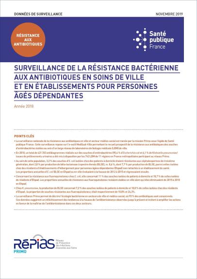 La surveillance nationale de la résistance aux antibiotiques en ville et secteur médico-social est menée par la mission Primo sous l'égide de Santé publique France. Cette surveillance repose sur l'e-outil MedQual-Ville permettant le recueil prospectif de la résistance aux antibiotiques des souches d'entérobactéries isolées au sein d'un large réseau de laboratoires de biologie médicale (LBM) de ville. En 2018, un total de 421 353 antibiogrammes réalisés sur des souches d'entérobactéries (90,4 % d'Escherichia coli et 6,1 % de Klebsiella pneumoniae) issues de prélèvements urinaires a été mis à disposition par les 742 LBM de 11 régions en France métropolitaine participant au réseau Primo. Au sein de cette population, 3,2 % des souches d'E. coli isolées chez des patients à domicile étaient résistantes aux céphalosporines de troisième génération, dont 2,8 % par production de bêta-lactamase à spectre étendu (BLSE), vs. 7,7 % de celles isolées chez des résidents d'établissements d'hébergement pour personnes âgées dépendantes (Ehpad) non rattachés à un établissement de santé. Les proportions annuelles d'E. coli BLSE en Ehpad ou en ville évoluaient à la hausse de 2012 à 2015 et régressaient ensuite. Concernant la résistance aux fluoroquinolones chez E. coli, elle concernait 11 % des souches isolées de patients à domicile et 18,7 % de celles isolées de résidents d'Ehpad. Les proportions annuelles de résistance aux fluoroquinolones restaient stables en ville alors qu'elles diminuaient de 2015 à 2018 en Ehpad. Chez K. pneumoniae, la production de BLSE concernait 7,2 % des souches isolées de patients à domicile et 18,8 % de celles isolées chez des résidents d'Ehpad ; la proportion de souches résistantes aux fluoroquinolones y était respectivement de 10,8% et 24,3%. La surveillance Primo permet de décrire l'écologie bactérienne en secteurs de ville et médico-social, où 93 % des antibiotiques sont consommés. Ces données suggèrent un infléchissement des tendances à la hausse de l'antibiorésistance observées jusqu'à présent et incitent à amplifier les actions en faveur de la maîtrise de l'antibiorésistance dans ces deux secteurs.