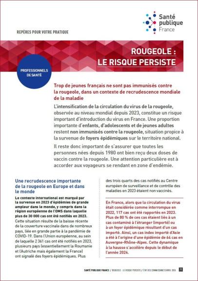 Ce document destiné aux professionnels de santé permet de faire un point épidémiologique, clinique et diagnostique dans un contexte de recrudescence mondiale de la rougeole. État des connaissances : avril 2024.