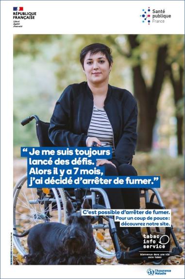 Affiche incitant à arrêter de fumer et faisant la promotion des aides à l'arrêt de Tabac info service auprès des personnes en situation de handicap.