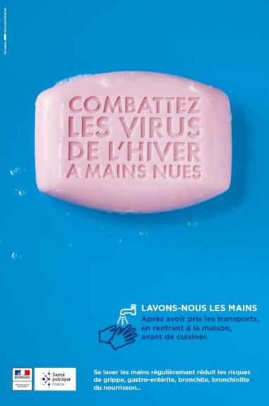 Cette affiche, qui montre un savon, porte le message : "Lavons-nous les mains après avoir pris les transports, en rentrant à la maison, avant de cuisiner". Elle comporte la signature "Se laver les mains régulièrement réduit les risques de grippe, gastro-entérite, bronchite, bronchiolite du nourrisson...