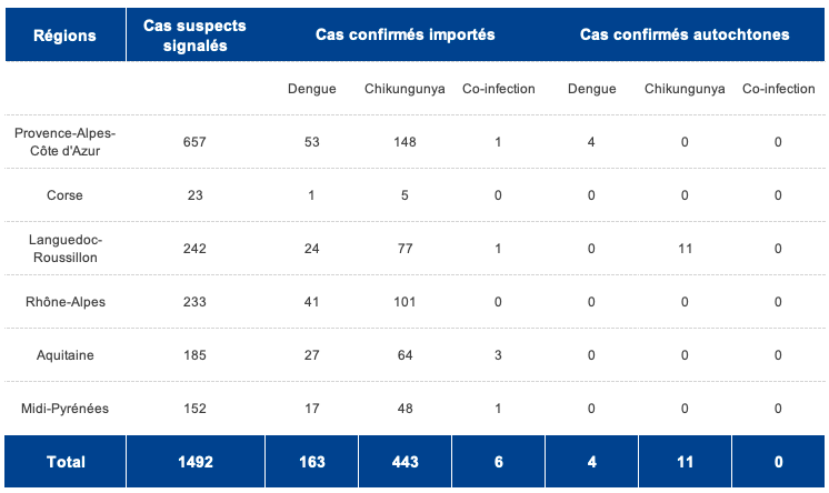 Du 1er mai au 30 novembre 2014 => 1492 cas suspects de dengue ou de chikungunya ont été signalés. Parmi eux ont été confirmés :