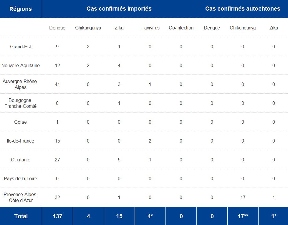 • 4 cas autochtones de dengue ont été confirmés par le Centre National de Référence (CNR) des arbovirus en région Provence-Alpes-Côte d’Azur. Les 2 premiers, confirmés les 20 août et 11 septembre sont survenus dans le département du Var. Ils ne sont pas liés car de sérotype différents (sérotype 1 et sérotype 2). Les 3ème et 4ème cas, confirmés les 18 septembre et 3 octobre dans le département des Bouches du Rhône sont liés et constituent un foyer. Les 2 patients résident dans le même voisinage et ont le même sérotype de dengue : sérotype 2. Ils ne sont pas liés aux cas du Var.